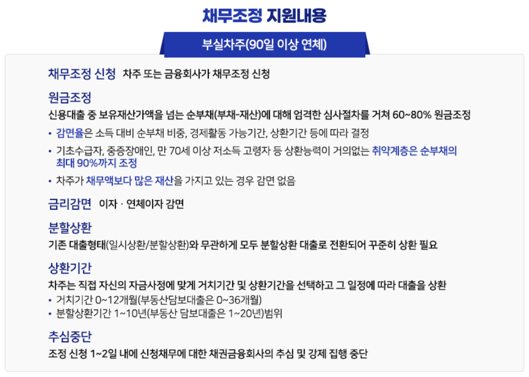 - 이자 감면 및 경감: 고금리 부채의 경우 이자율을 낮춰주어 연체 위험을 줄이는 효과가 있습니다.