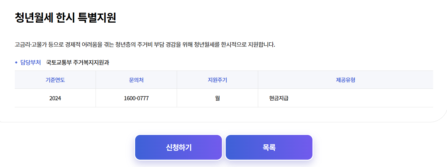 - 복지로 로그인 후, 서비스 신청 > 복지급여 신청 > 기타 > 청년월세 한시 특별지원을 선택해 신청할 수 있습니다.